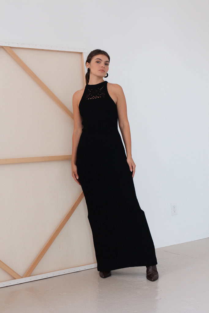 Black 1970s Knit Halter Maxi Dress