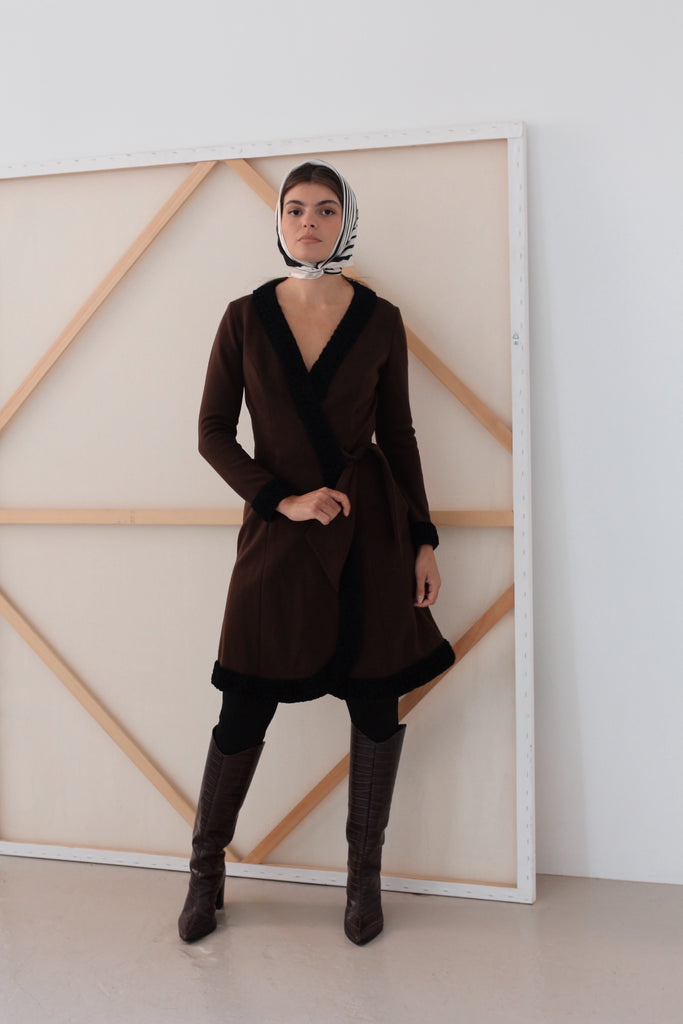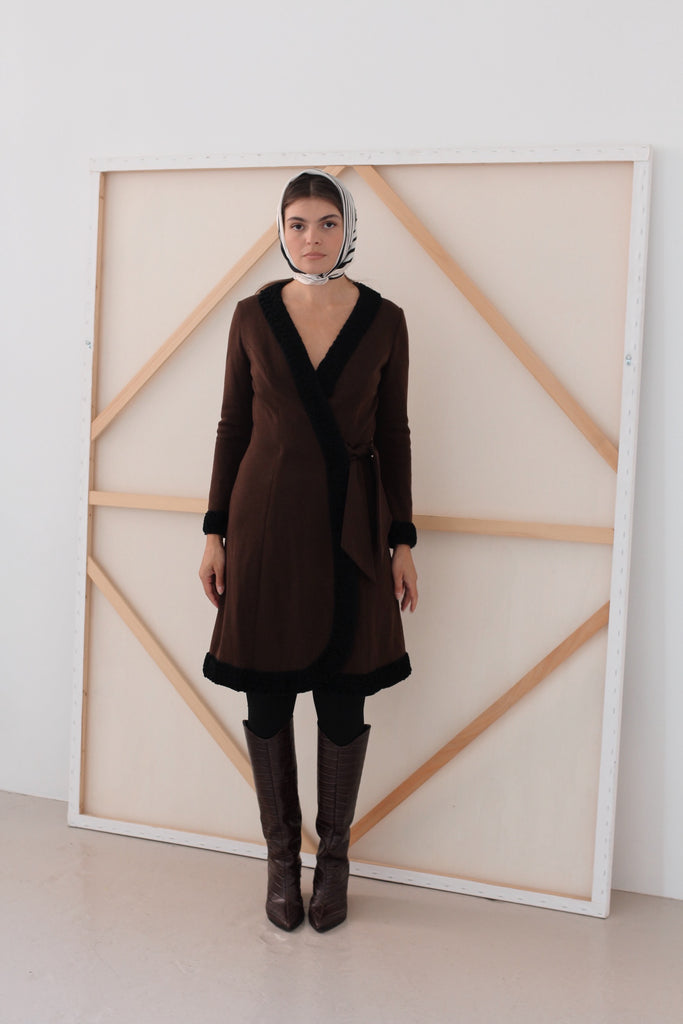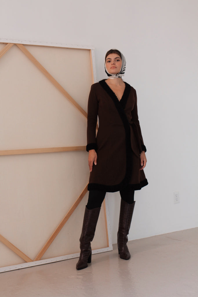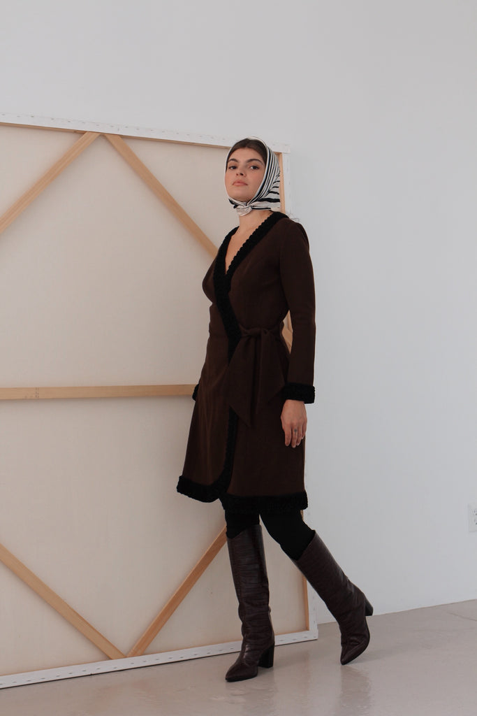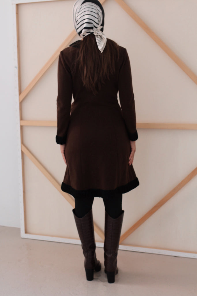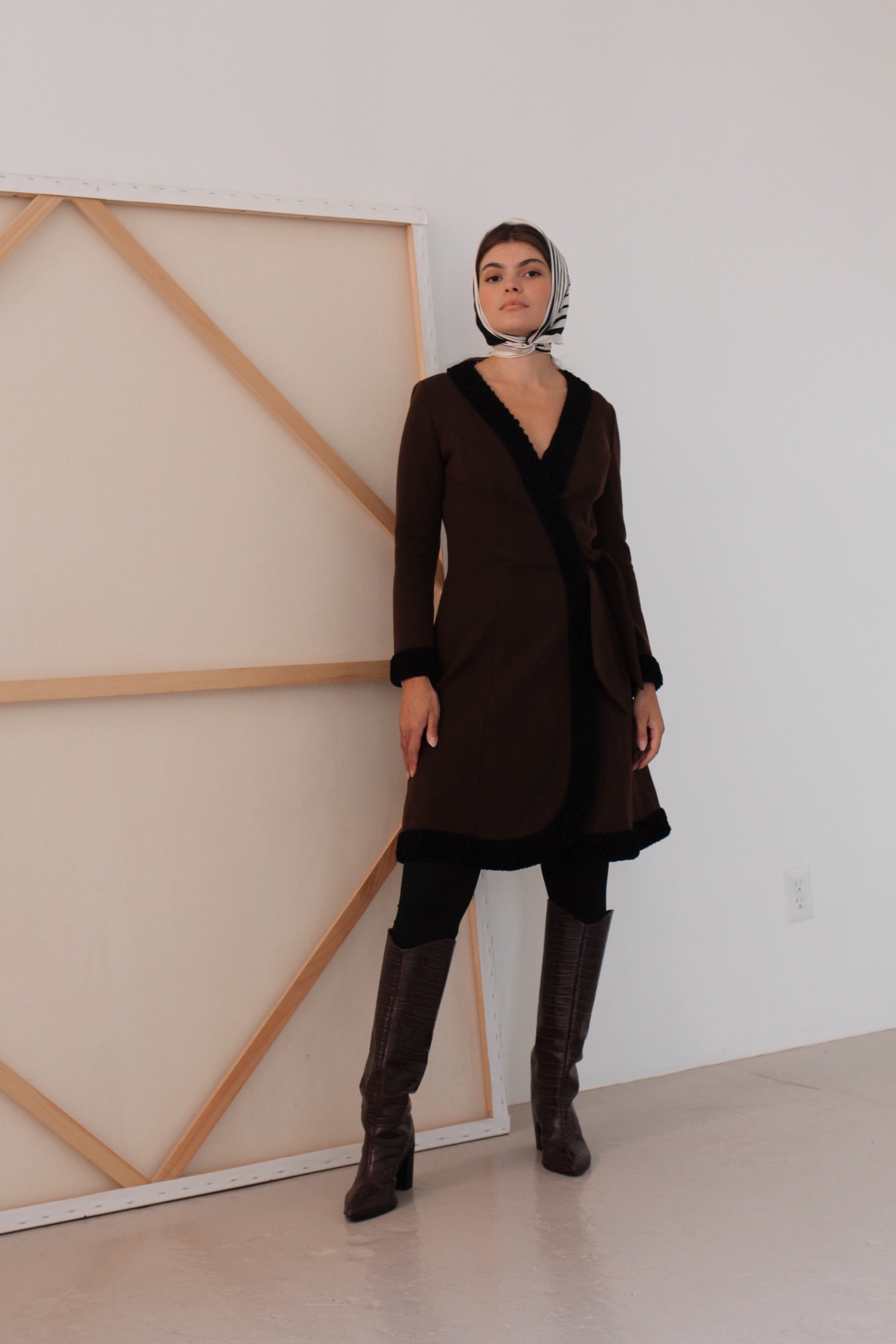 This Alfred Weber brown wool wrap dress from the 1960s combines sophistication with cozy warmth. Crafted from rich brown wool, it offers exceptional comfort and insulation for cooler days. The black fur trim adds a luxurious accent, elevating the vintage silhouette with refined texture and visual interest. I believe the fur trim is real.