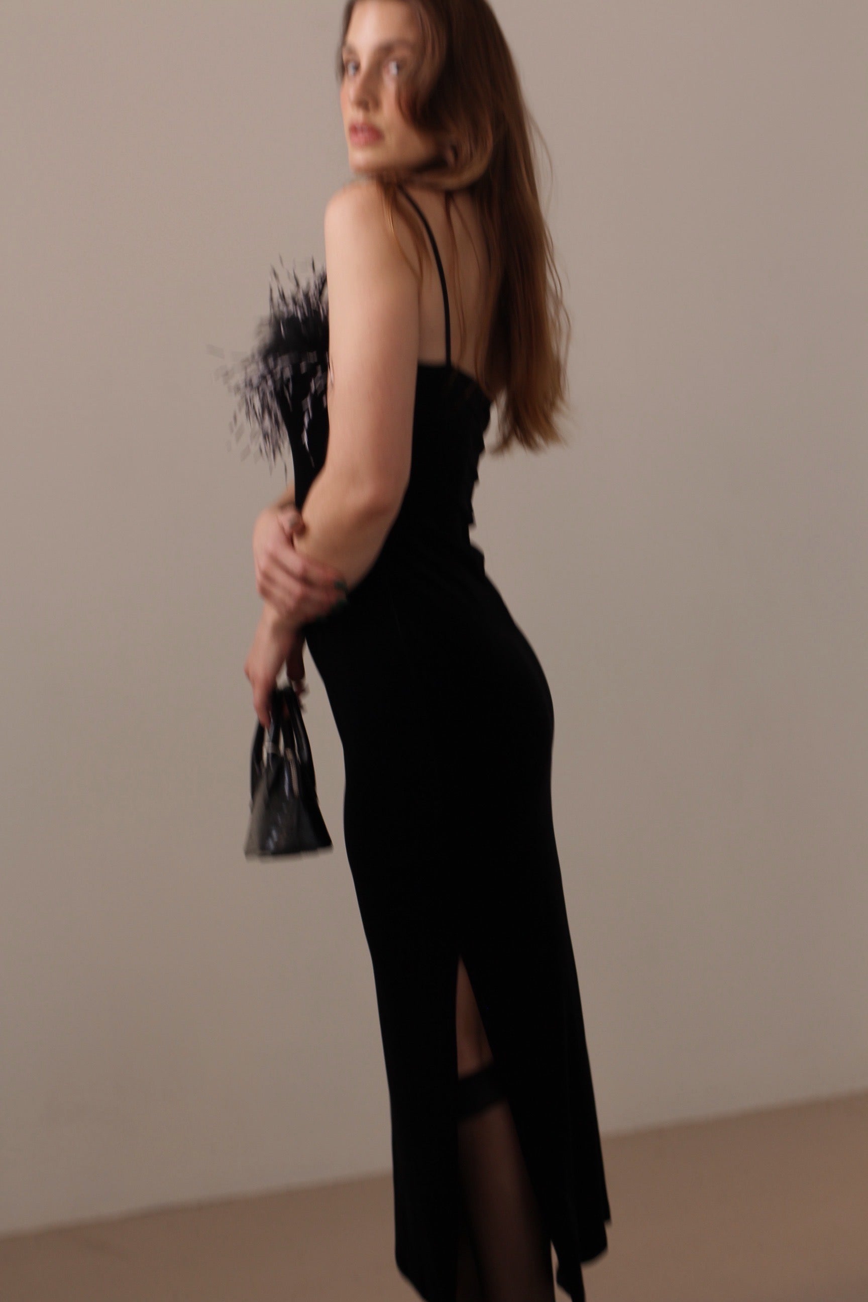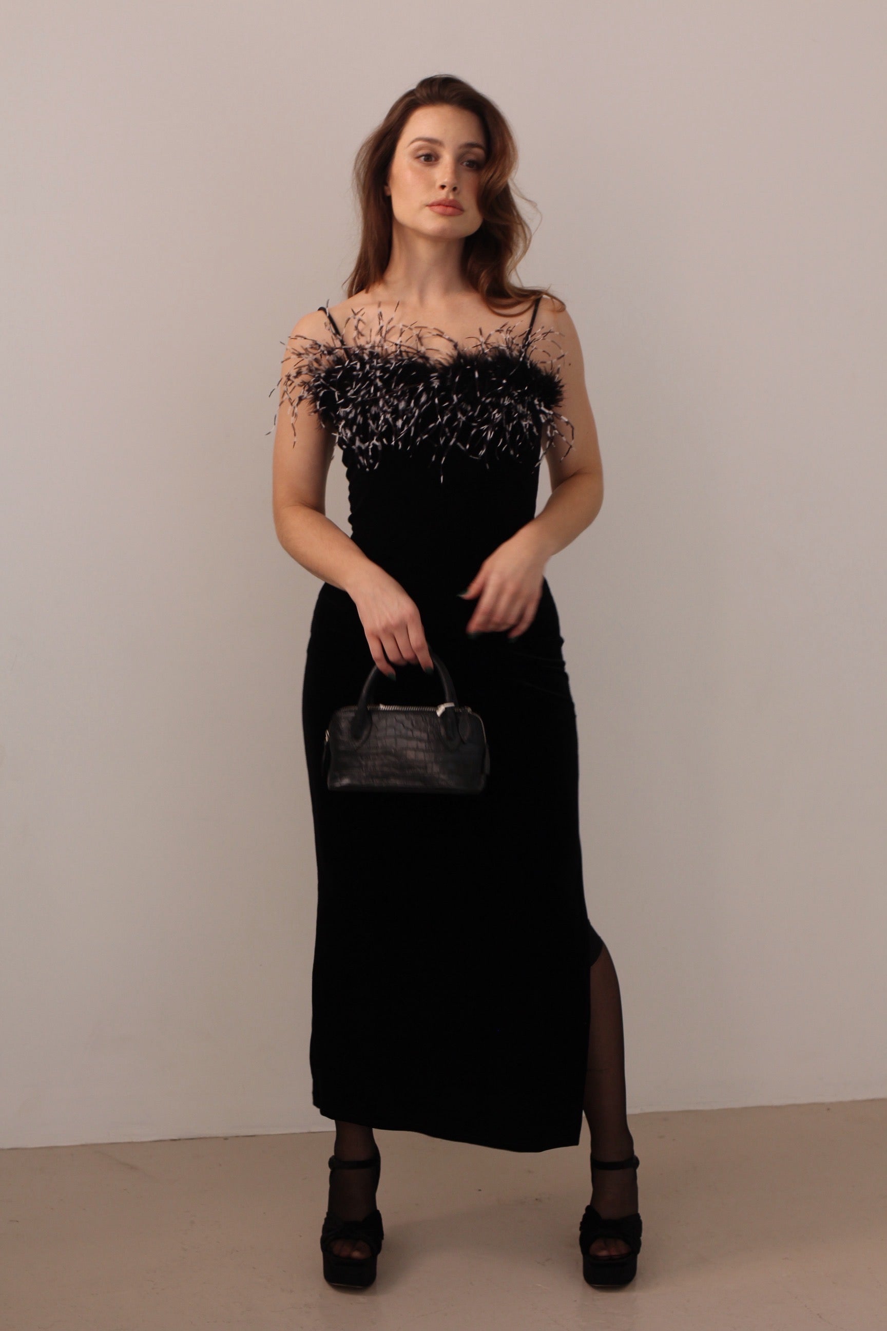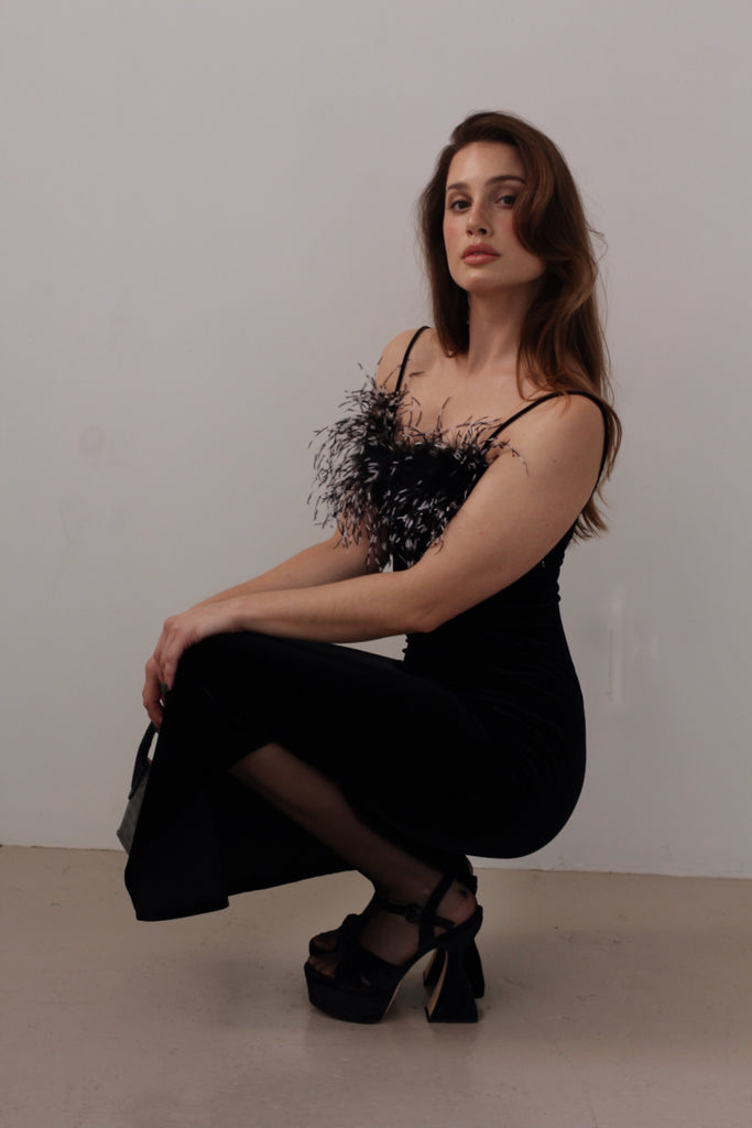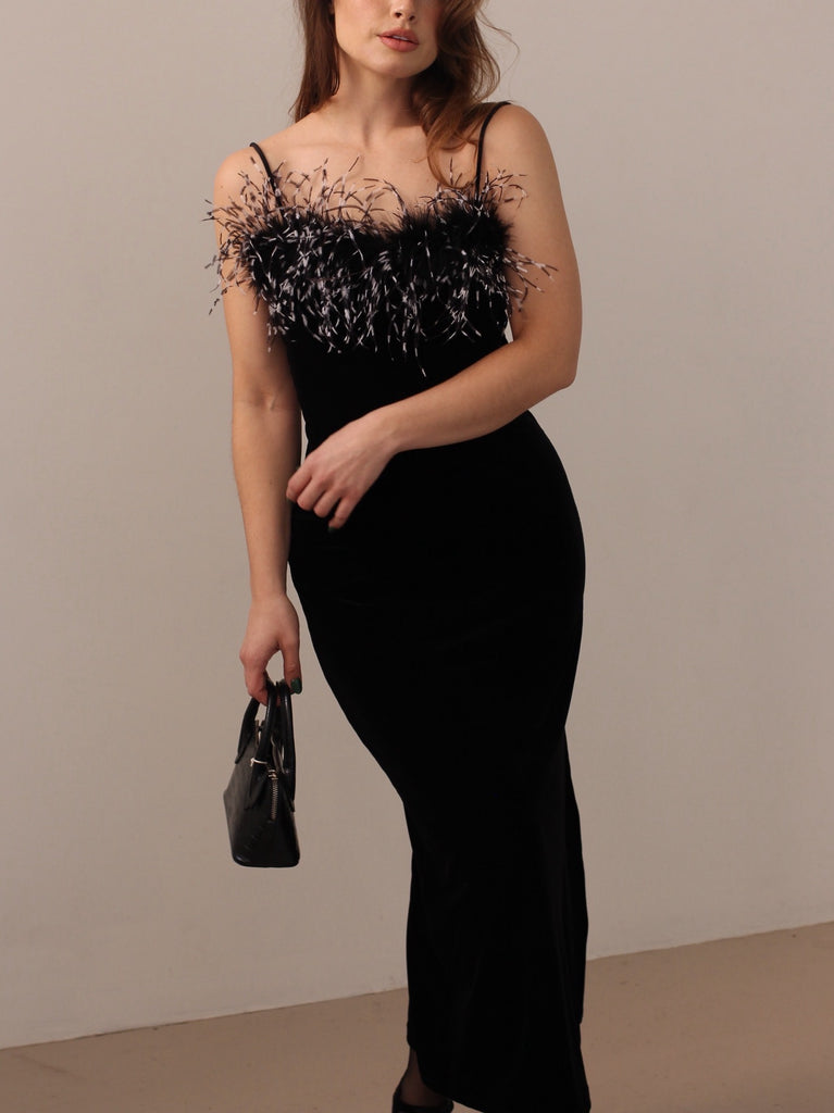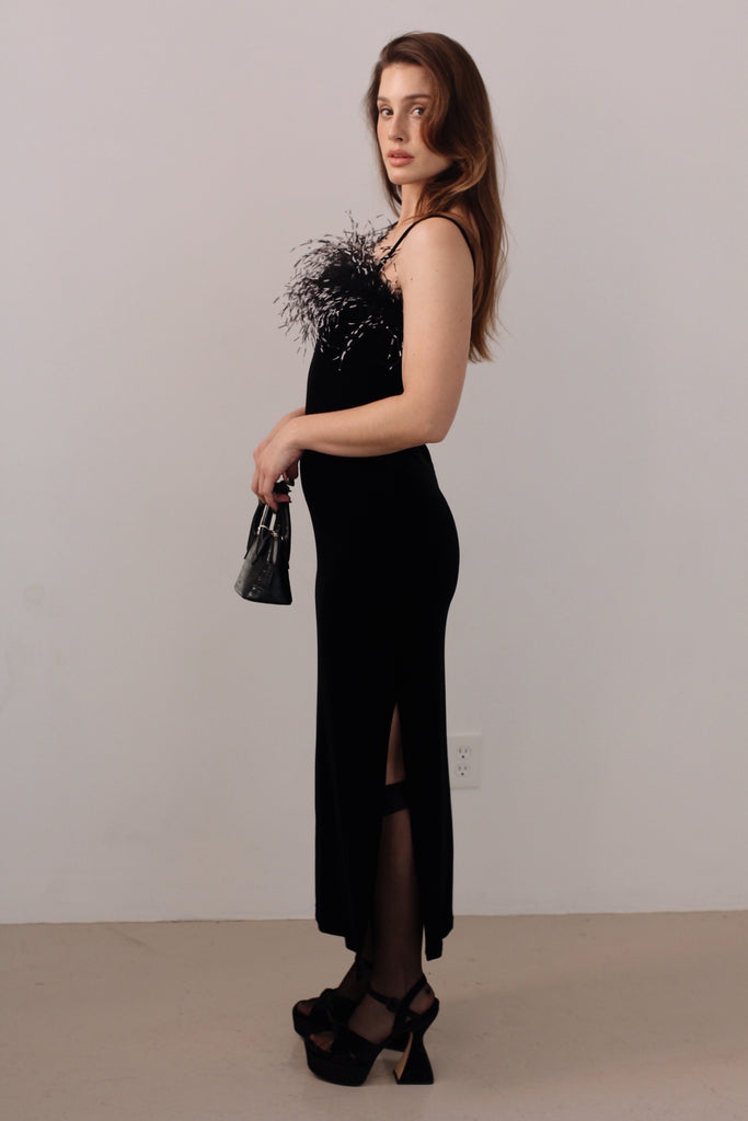 Rare Black stretch velvet dress with feather trim by Georgiou studio. features one side slit and thin straps.