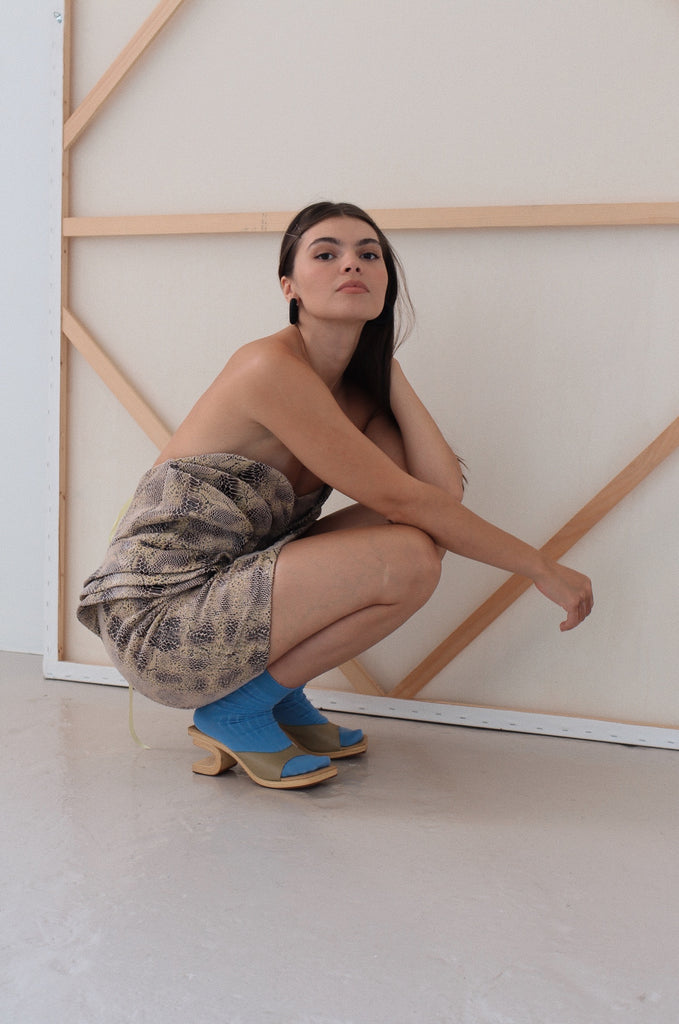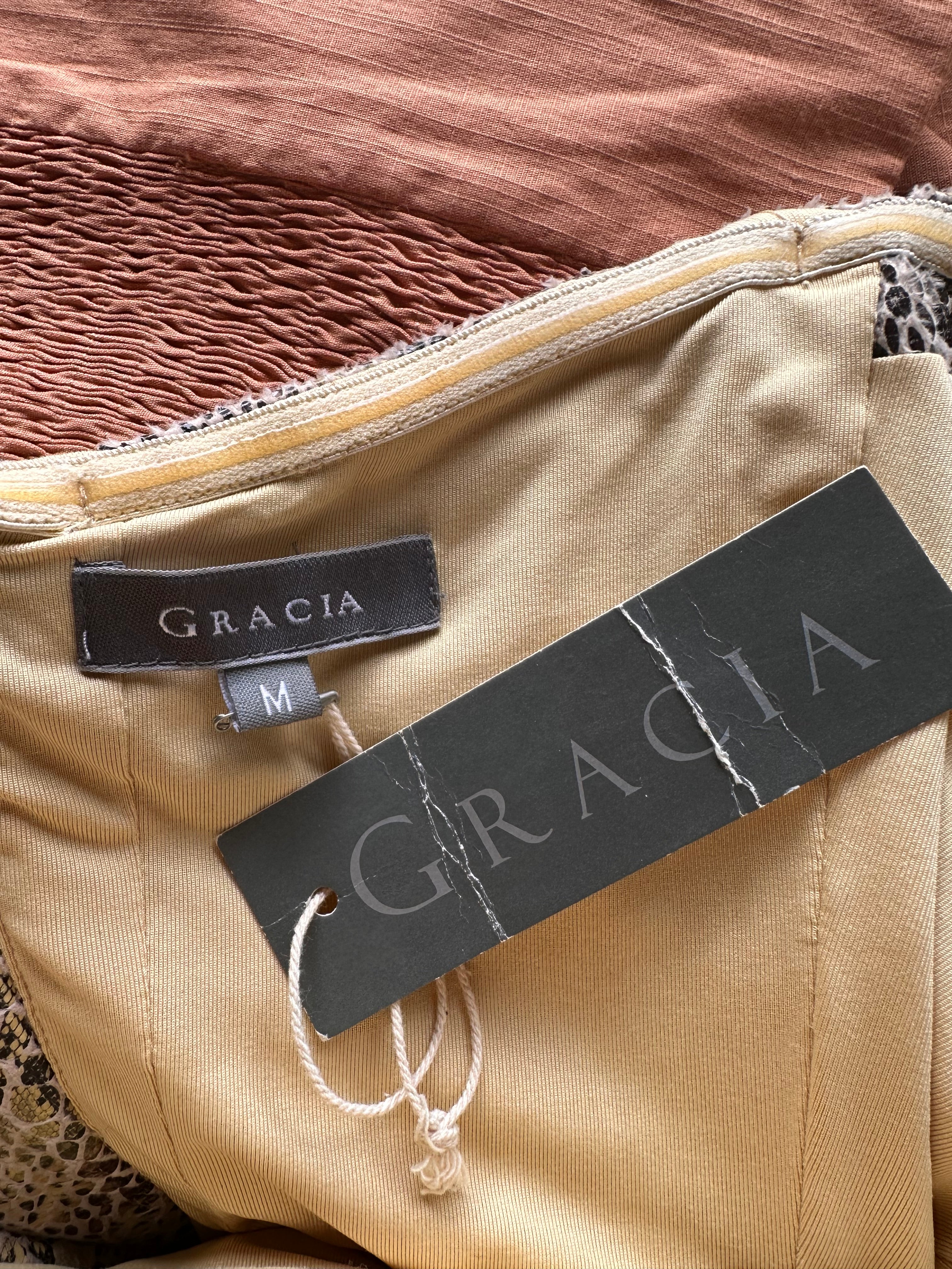 2000s snakeskin effect dress featuring sculptural elements and a lace up closure. The ribbon could be replaced with any color you would like. There is boning in this dress to hold structure. Original tags are still attached