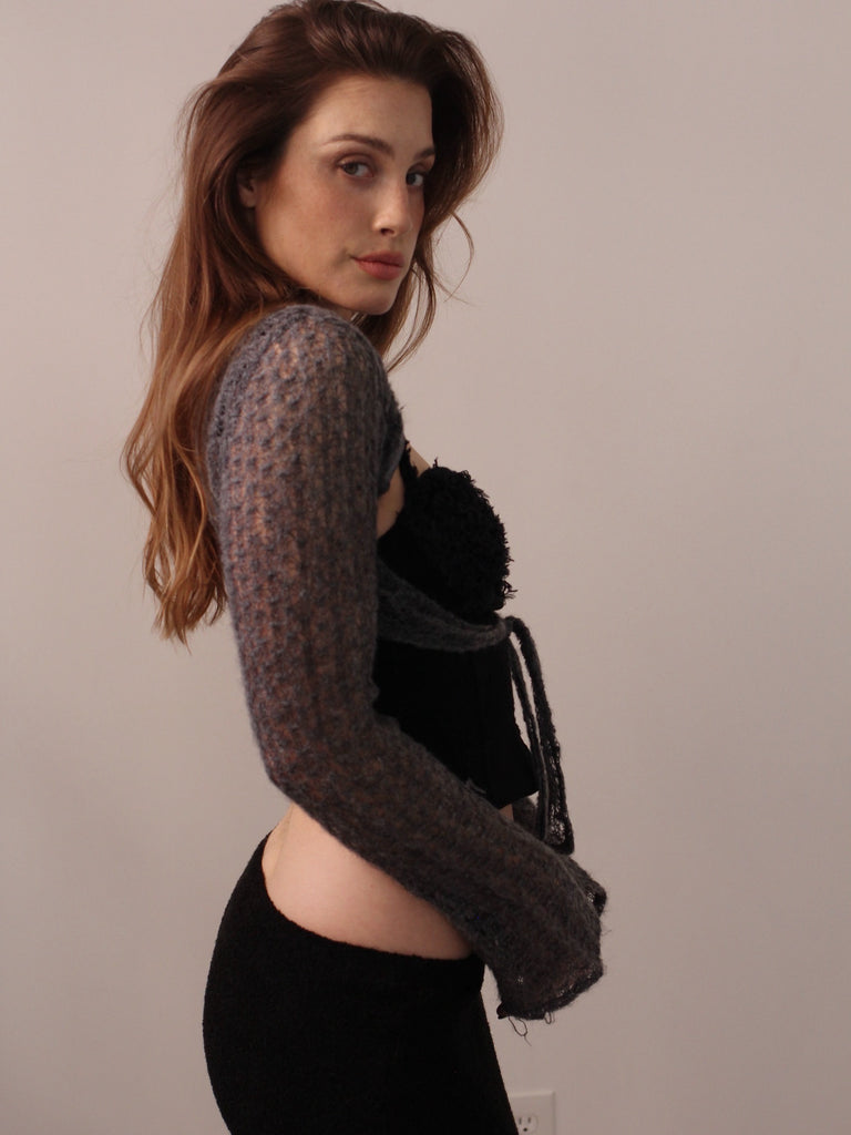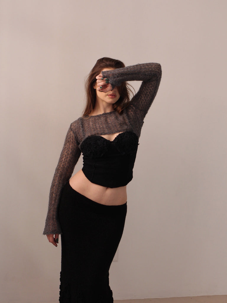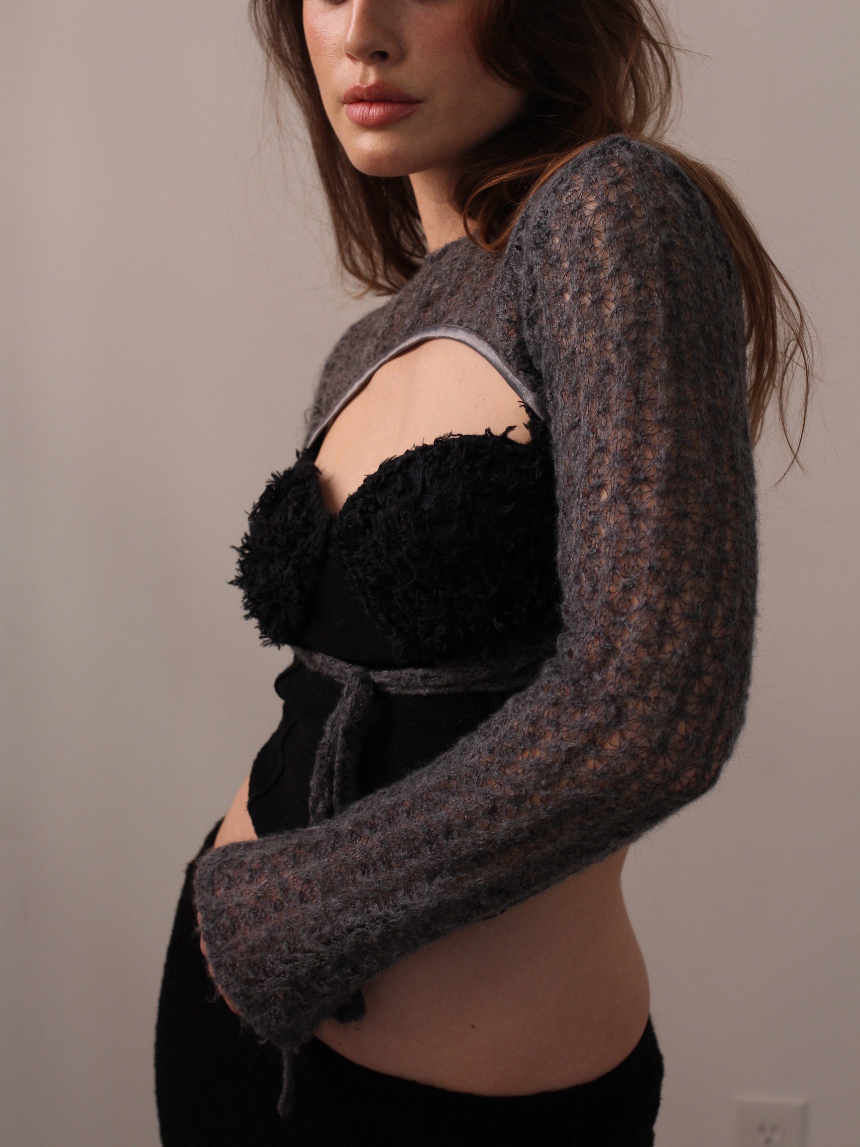 Vintage bebe (circa 2009) grey mohair blend shrug. Made in france. bell shape sleeves. Of course i had to see what it looked like backwards and it was gorgeous that way too. If you wanted to wear it that way, you would just need to carefully remove the tags.
