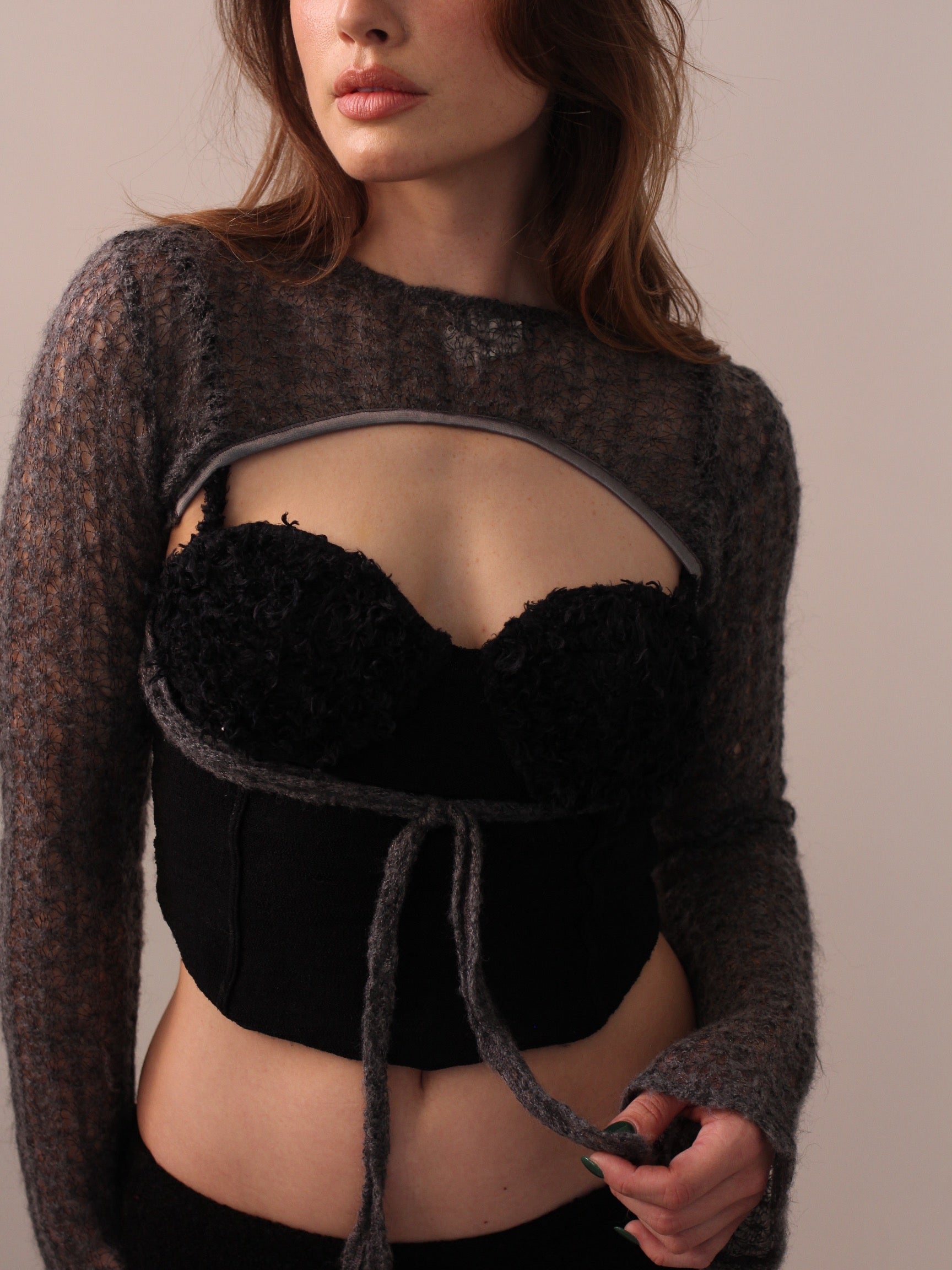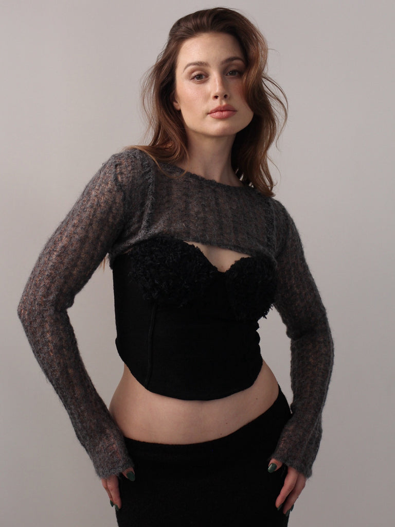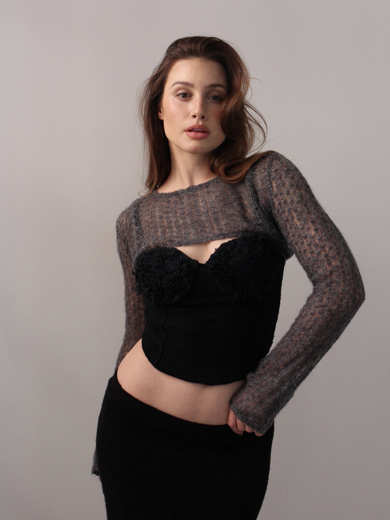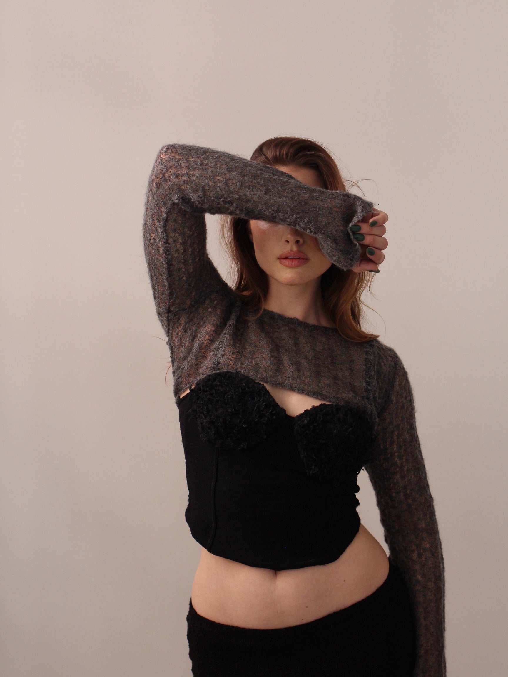 Vintage bebe (circa 2009) grey mohair blend shrug. Made in france. bell shape sleeves. Of course i had to see what it looked like backwards and it was gorgeous that way too. If you wanted to wear it that way, you would just need to carefully remove the tags.