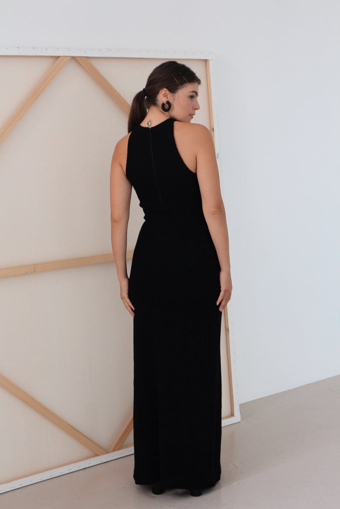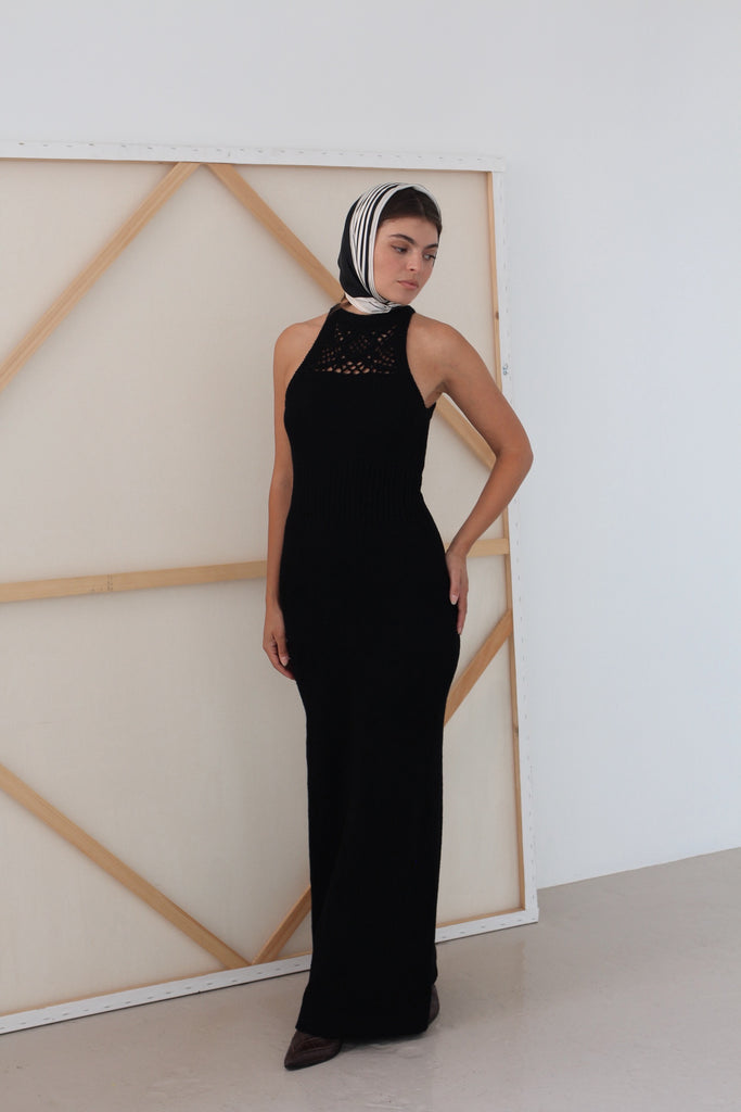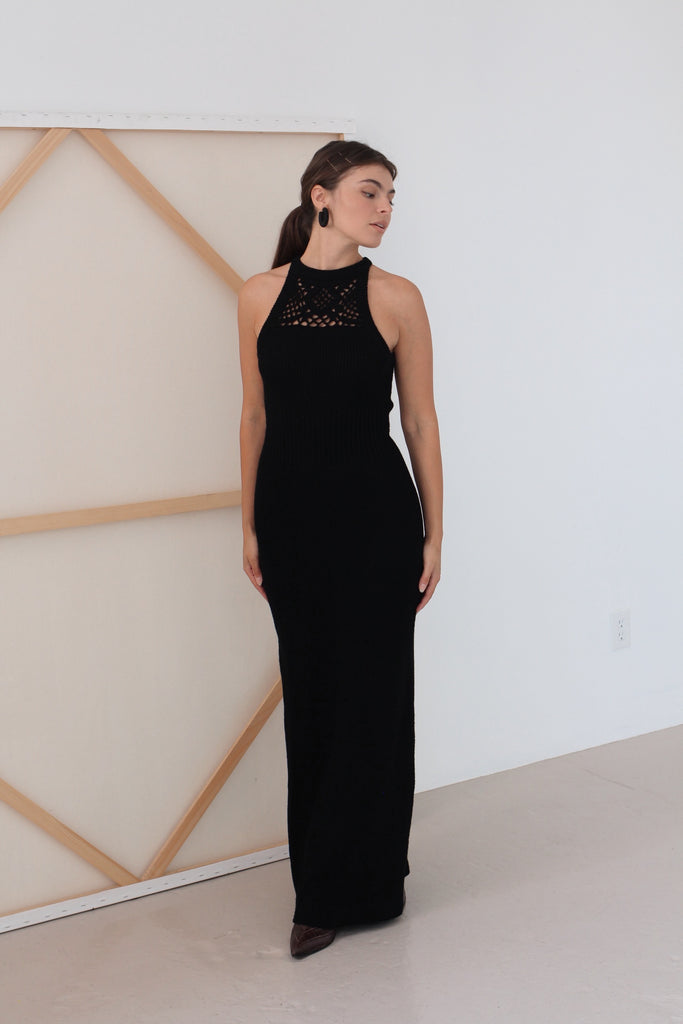 Bargello 1970s black knit halter dress with gorgeous open knit detail accentuating the neckline.