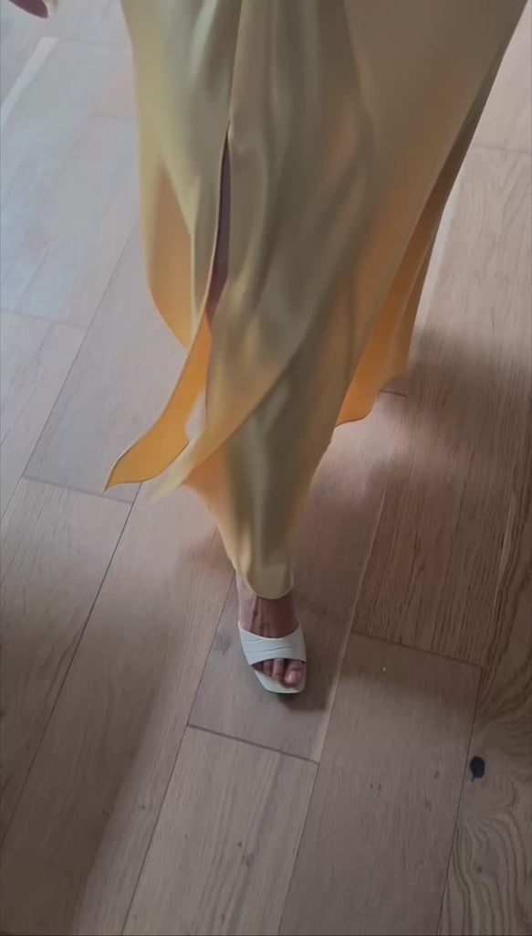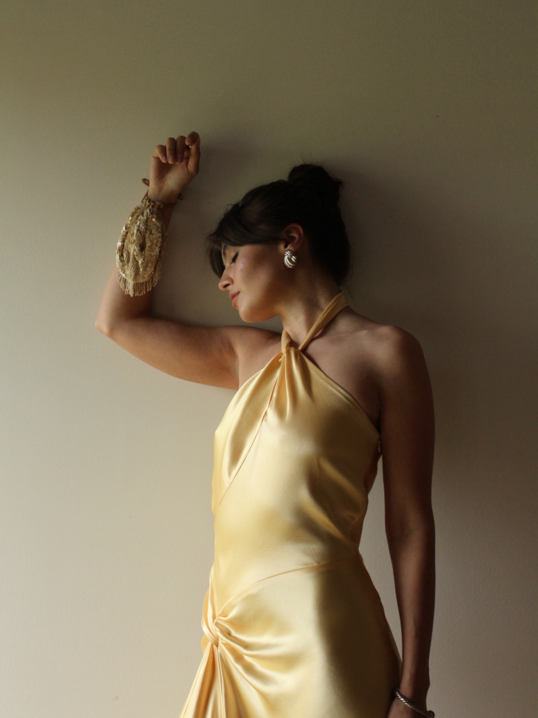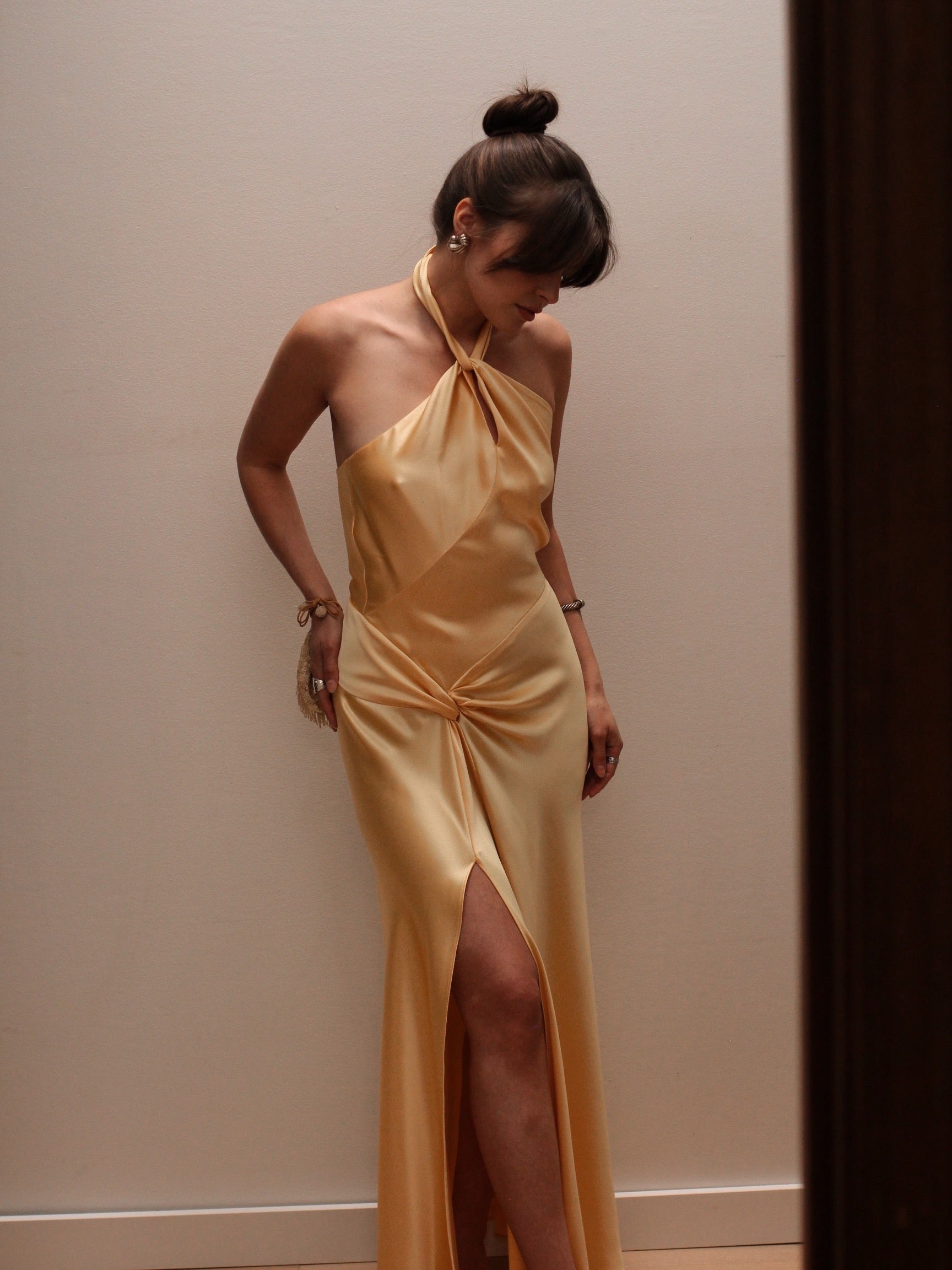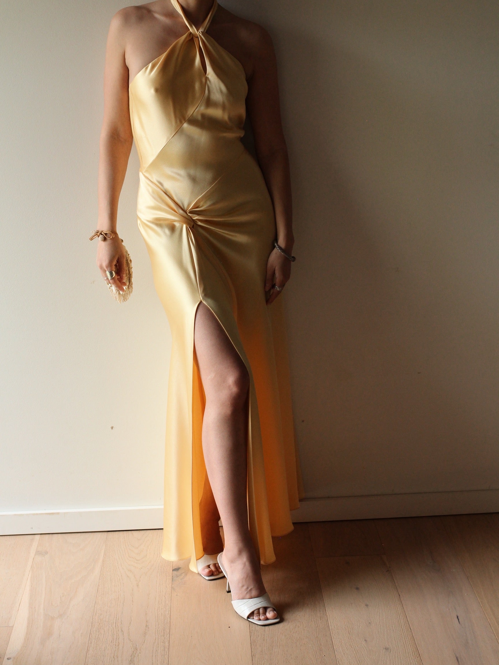 Beautiful yellow halter dress of dreams featuring a flattering twist at the neckline and across the waist. the seams accentuate every curve in the most flattering way.